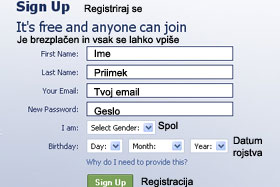 V spodnjem desnem kotu je tako imenovan Sign up obrazec. Izpolnite potrebne podatke (ime, priimek, e pošto, geslo, spol, datum rojstva), pritisnite Sign up (registracija), vpišite dane črke in številke, še enkrat pritisnite gumb Sign up (registracija) ter sekundo počakajte.