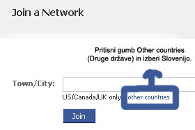 Sedaj boste izpolnili več podatkov. 1. je pomemben za iskanje prijateljev po email naslovih, sledi podatek o izobrazbi in zadnji je podatek o tem, kje živite. Tu izberite Other countries in izberite Slovenijo (glej sliko). Slednje podatke vam ni treba izpolniti, toda to dejanje je priporočljivo. Na koncu pritisnite gumb Join (vpis). |