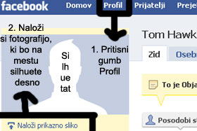 Pritisni gumb Profil (zgoraj) in potem (pod silhueto) Naloži prikazano sliko. (glej sliko) Odprlo se vam je novo okence. Pritisnite gumb Brskaj in izberite svojo fotografijo, ki ne bo težja od 4 megabitov. (priporočena je namestitev osebne fotografije, za lažjo prepoznavnost) |