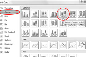 Nato izberite Stacked Column in 3D (peta predloga od leve proti desni) in pritisnite gumb OK. (prikazano na sliki) |