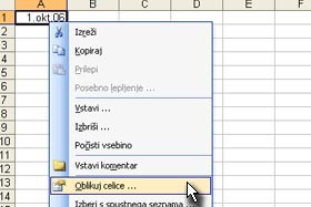 Kliknite z desnim miškinim gumbom na celico 1A (oziroma tja, kjer ste vpisali datum) in izberite Oblikuj celice ... |