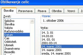 Na desni strani izberite Datum in potem na levi format zapisa. Jaz sem izbral "14. marec 2001" in potrdil na V redu. |