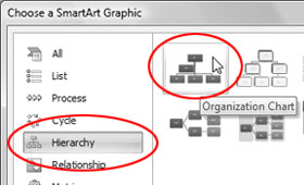 Vstavite nov list (Title and content). Imenujte jo Sezone. Pritisnite zavihek Insert in potem SmartArt. Odpre se vam novo okno. Izberite možnost Hierarchy in potem poljubno hierarhično obliko.