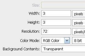 V novem oknu določite Width in Height 3 pixels in Color Mode določite Transparent.