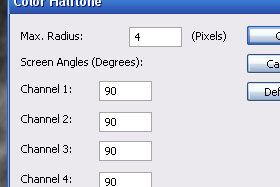 V novem oknu določite Max. Radius 4 pixels, Channel 1, 2, 3, 4 pa 90 stopinj. Kliknite na gumb OK. |