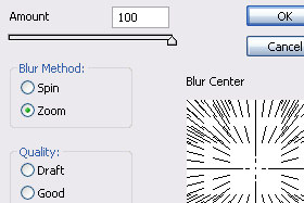 V novem oknu določite Amount na 100, Blur Method Zoom in Quality Best. Potrdite na gumb OK. |