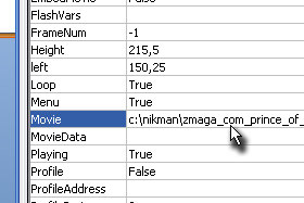 Poiščite polje Movie in v njega vpišite lokacijo in ime datoteke Flash datoteke, ki ste jo prej shranili (glej sliko). V mojem primeru je to c:/nikman/zmaga_com/prince_of_persia.swf. |