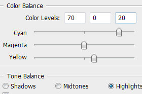 Spodaj označite sedaj Highlights in tokrat nastavite Color Levels 70, 0 in -20 (glej sliko).