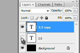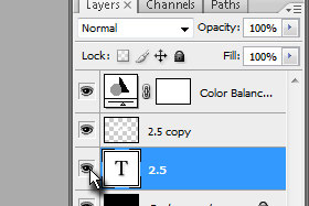 Potem pa prvi layer z napisom skrijte (kliknite na ikono z očesom; glej sliko). Dupliciran layer naj bo še vedno označen. |