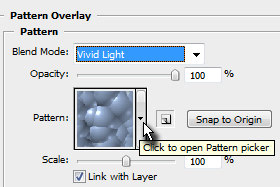 Ko vas vpraša za ime novega nastavitvenega layerja, potrdite na gumb OK. Potem pa v novem oknu določite Blend Mode na Vivid Light in nato pri polju Pattern kliknite na puščico navzdol (glej sliko)... |
