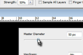 Kliknite z desnim miškinim gumbom na dokument in določite poljubno velik Master Dimater (velikost čopiča) in Hardness 0% (glej sliko).