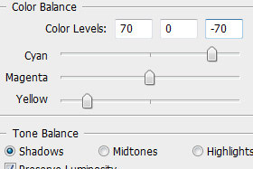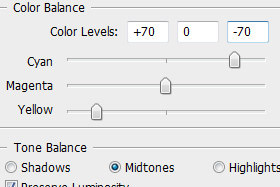 V novem oknu spodaj označite Midtones in nastavite Color Levels +70, 0 in -70 (glej sliko). |