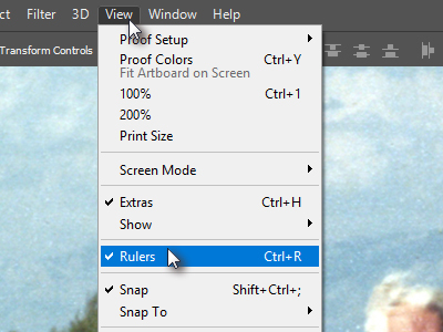 ![]() Odprite poljubno sliko in nato kliknite zgoraj na View ter izberite Rulers, da vklopite prikaz ravnila. Možnost Snap naj bo tudi označena. |