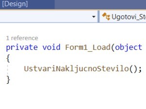 ![]() Potem začnemo programiranje. Želimo ustvariti funkcijo, ki nam ustvari oz. zgenerira novo število. Še prej jo bomo poklicali, zato dvakrat hitro klinemo na našo formo. Potem se nam odpre programska koda in vanjo vnesemo: private void Form1_Load(object sender, EventArgs e) { UstvariNakljucnoStevilo(); } |