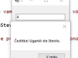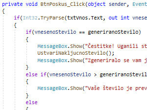 ![]() Na koncu gremo nazaj na vizualni pogled programa in naredimo dvoklik na gumbu. Tukaj pa naredimo izpise: private void BtnPoskus_Click(object sender, EventArgs e) { if(Int32.TryParse(txtVnos.Text, out int vnesenoStevilo)) { if(vnesenoStevilo == generiranoStevilo) { MessageBox.Show("Čestitke! Uganili ste število."); UstvariNakljucnoStevilo(); MessageBox.Show("Zgeneriralo se vam je novo število. Na voljo imate nov poskus."); } else if(vnesenoStevilo > generiranoStevilo) { MessageBox.Show("Vaše število je preveliko. Poskusite ponovno."); } else { MessageBox.Show("Vaše število je premajhno. Poskusite ponovno."); } } else { MessageBox.Show("Niste vnesli veljavnega števila."); } txtVnos.Clear(); } |