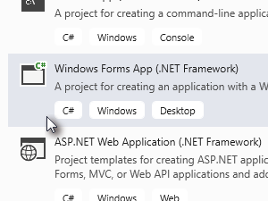 ![]() Izberete Windows Form App (.NET Framework) in potrdite z gumbom Next. |