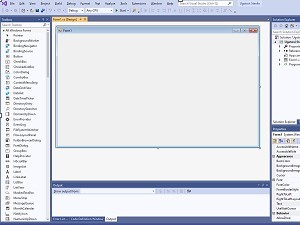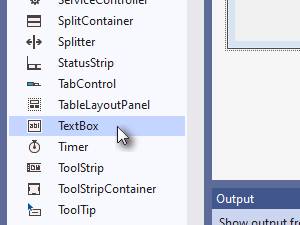 ![]() V levem delu zaslona imamo (privzeto) prikazan Toolbox. V njem poiščemo gradnik TextBox (polje za vpis besedila) in ga z levim klikom miške premaknemo v naš formo (Form1 - se nahaja na sredini). |