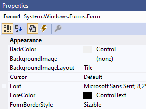 ![]() Sedaj spremenimo gradnikom lastnosti. Za spremembo lastnosti gradnika najprej kliknemo na le-tega in potem spremenimo vrednosti v oknu Properties (se nahaja spodaj desno). Gradniku Form1 nastavimo: