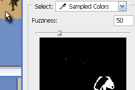 Kliknite zgoraj na Select in izberite Color Range... V novem oknu določite Fuzziness na okoli 50 % in nato kliknite na barvo, ki jo želite odstraniti. Potrdite na gumb OK. |
