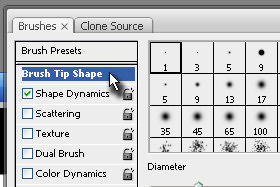 Prikaže se okno z nastavitvami čopiča. Označite na levi Brush Tip Shape. |