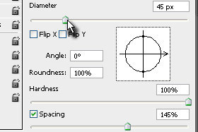 Potem pa določite poljuben Diameter (ki bo služil za velikost odrezanega dela znamke), Hardness 100% in Spacing 145% (glej sliko).