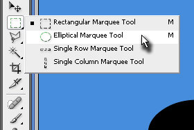 S tem smo pisavo spremeni v navaden layer. Izberite orodje Elliptical Marquee Tool. Držite z miškinim gumbom na orodju Rectangular Marquee Tool (bližnjica je tipka M) in prikazala se vam bodo ostala orodja. |