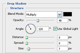 V novem oknu določite Blend Mode na Multiply, Opacity 40 % (glej sliko). Distance določite 0 px, Spread 0 % in Size 7 px. Ne zaprite še okna... |