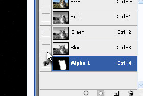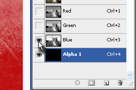 Označite seamo kanal Alpha 1 in nato kliknite na prostor, kjer se določa vidnost kanala Blue (glej sliko), da boste videli sliko v rdečkasti barvi. |