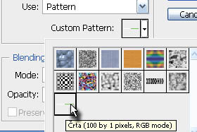 Kliknite zgoraj na File in izberite New... (jaz sem ustvaril dokument v velikosti 1024 * 768 pik). Kliknite zgoraj na Edit in izberite Fill... V novem oknu preko Use določite Pattern, kliknite na malo puščico navzdol (glej sliko) in izberite prej ustvarjen vzorec. Potrdite na gumb OK. |