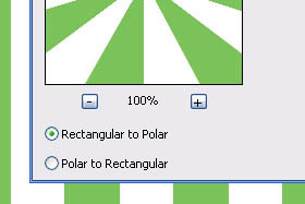 Kliknite zgoraj na Filter, Distort in izberite Polar Coordinates... V novem oknu označite Rectangular to Polar in potrdite na gumb OK. |