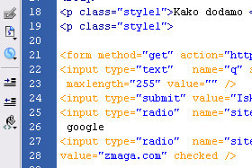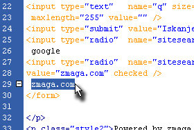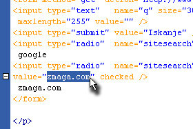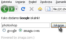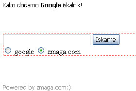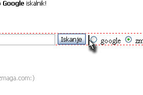 <form method="get" action="http://www.google.com/search"> <input type="text" name="q" size="30" maxlength="255" value="" /> <input type="submit" value="Iskanje" /> <input type="radio" name="sitesearch" value="" /> <input type="radio" name="sitesearch" value="zmaga.com" checked /> zmaga.com </form> |