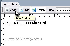 Klikknite na Code, da se bo spletna stran prikazala v HTML kodi.
