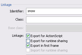 Označite Export for ActionScript in Export in first frame ter v polje Indentifier vpišite snow.