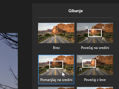 ![]() V novem oknu označite poljubno animacijo ter kliknite na gumb Dokončaj. Fotografija je v končnem filmu videti veliko bolj atraktivna, če je v premikajočem stanju. |