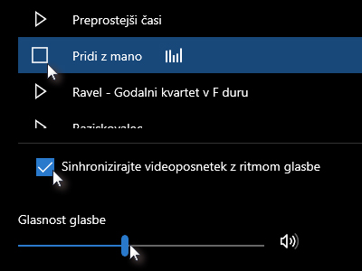 ![]() V novem oknu določite poljubno glasbeno spremljavo, označite Sihronizirajte videoposnetek z ritmom glasbe ter nastavite še glasnost glasbe. Kliknite na Dokončano, ko boste končali. |