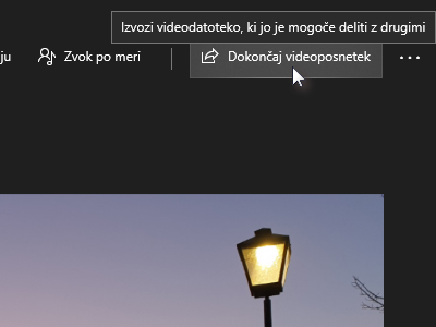 ![]() Vaš film je nared za izvoz v datoteko za ogled. Kliknite na gumb Dokončaj videoposnetek. |