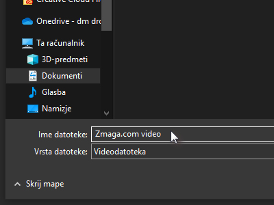 ![]() V oknu z raziskovalcem določite mapo, kamor želite shraniti datoteko ter jo tudi poljubno imenujte. Potrdite in film se bo začel shranjevati. |