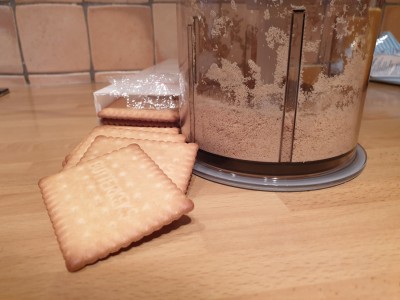 Najprej je potrebno zmleti 200 gramov maslenih piškotov. Če mešalca nimate, lahko to storite tudi z roko in recept bo na koncu imel hrustljav dodatek. Ko bodo zmleti, jih dajte v neko večjo posodo.