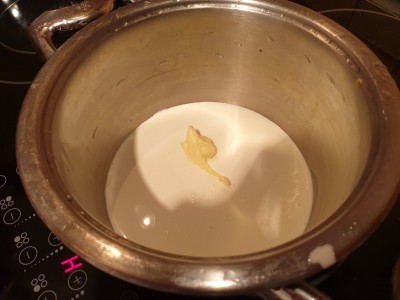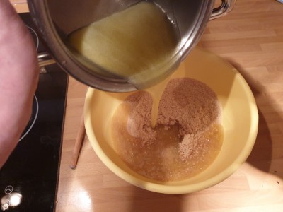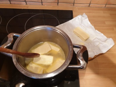 Ko se bo sladkor v vodi začel malenkost cvreti, dodajte še približno 230 gramov masla. Na moji sliki je ostanek tipičnega masla, ki ga lahko kupite v trgovini. Premešajte vse skupaj tako dobro, da postane lepa tekoča zmes. |
