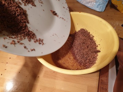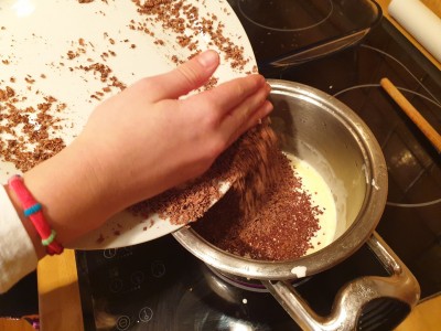 Dodajte še približno 50 gramov zmlete jedilne čokolade in vse skupaj dobro premešajte, da bo postala lepa masa. |
