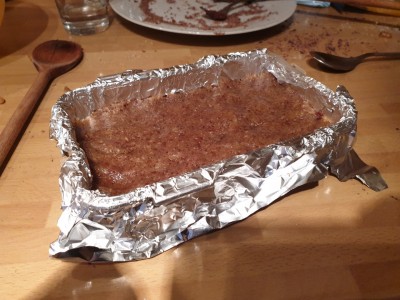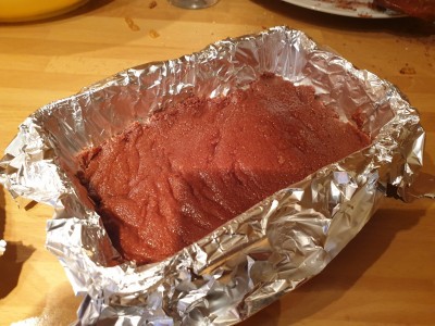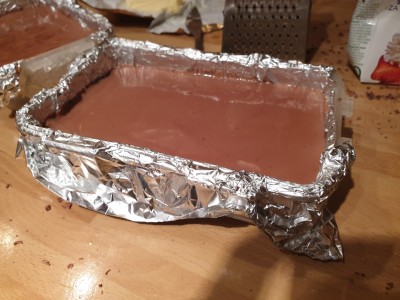 Pripravite manjši pekač in vanj vlijte pripravljeno maso s čokolado ter jo enakomerno razdelite in zgladite. Pri meni je masa debela približno en centimeter. Jaz pekača nisem našel, pa sem improviziral z neko plastično posodo, katero sem obdal z alu folijo. |