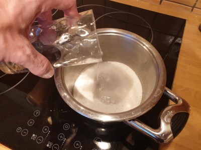 Pripravite posodo, kjer dodajte 100 gramov sladkorja, približno 10 žlic vode ter vse skupaj grejte na polovični temperaturi. |