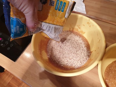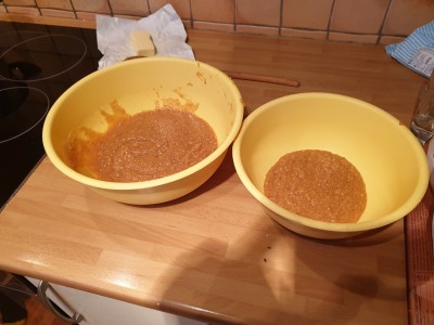 Razdelite ravnokar pripravljeno maso v dve posodi. |