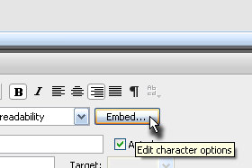 Sedaj bomo še uporabljeno pisavo shranili v dokument, saj si želimo, da jo vidijo vsi uporabniki. Potem pa spodaj v oknu Properties kliknite na gumb Embed... |
