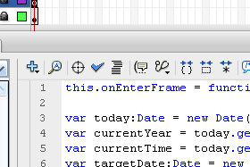 this.onEnterFrame = function() { var today:Date = new Date(); var currentYear = today.getFullYear(); var currentTime = today.getTime(); var targetDate:Date = new Date(2008,11,24); var targetTime = targetDate.getTime(); var timeLeft = targetTime - currentTime; var sec = Math.floor(timeLeft/1000); var min = Math.floor(sec/60); var hrs = Math.floor(min/60); var days = Math.floor(hrs/24); sec = string(sec % 60); if (sec.length < 2) { sec = "0" + sec; } min = string(min % 60); if (min.length < 2) { min = "0" + min; } hrs = string(hrs % 24); if (hrs.length < 2) { hrs = "0" + hrs; } days = string(days); var counter:String = days + ":" + hrs + ":" + min + ":" + sec; time_txt.text = counter; } |