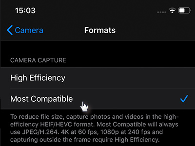 ![]() V polju Camera Capture označite Most Compatible. Heigh Eficiency nastavitev ustvarja fotografije v formatu HEIF, k isicer ustvarja malo boljšio kvaliteto kot JPEG in porabi manj prostora, vendar pa ga veliko naprav ali predvajalnikov še ne podpira najbolje. |