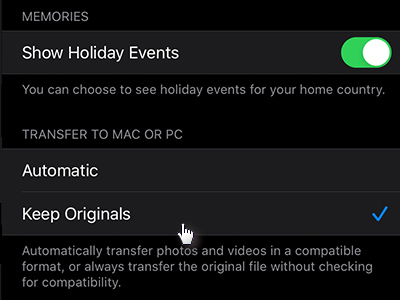 ![]() V polju Transfer to Mac or PC označite Keep Originals. Ta nastavitev pride prav, ko vam med kopiranjem datotek v okolju Windows prikaže napako "The device is unreachable". |