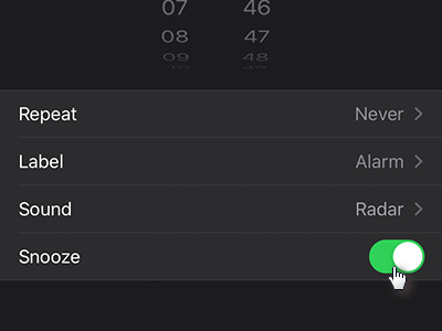 ![]() Snooze pustite označeno, da boste lahko alarm večkrat utišali. Tukaj lahko nastavite tudi ponavljajoč alarm, ga imenujete ter nastavite tudi poljuben zvok. |