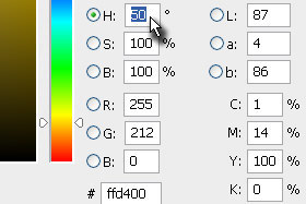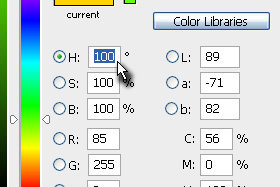 ![]() V oknu za določanje barve določite H (Hue) na 50 in potrdite na gumb OK. |