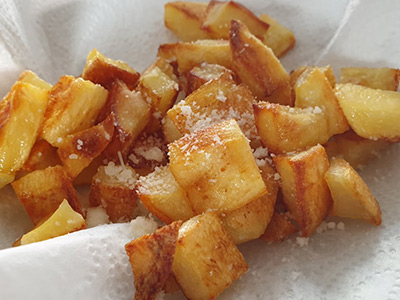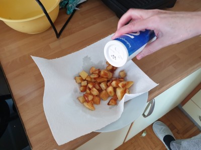 Postavite ga v neko posodo z kuhinjsko brisačo, da se olje vpije ter ga posolite po želji.